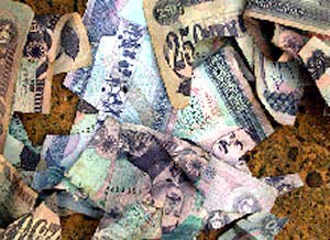 When regimes fall, for whatever reason, they leave behind the trappings of their government. Cash usually lasts the longest, simply because it's an indispensable commodity. But when the money depicts a disgraced dictator at the height of his power, it can make for an awkward transition. The dinars locked away in the Central Bank (with the inscription "Built in the age of Saddam Hussein") have been twice defiled - bombed by coalition forces, then looted by thieves unconcerned about whose face was on the bill. The bank is littered with shreds of 250-dinar notes, blown apart and scattered by wind. About $400 million in hard currency and about 20 billion dinars were looted in the lawlessness that accompanied U.S. forces into Baghdad, Mullinax said. That - and uncertainty over the dinar's future - has produced a wave of rumors and seesawing exchange rates. Before Saddam invaded Kuwait in 1990, a single dinar cost $3. But then came the 1991 Gulf War and U.N. sanctions that impoverished Iraq, and by March - the eve of the 2003 war - it was trading at 2,600 to the dollar. It dropped to 3,400 after U.S. forces invaded Baghdad. But in recent days it has surged, a development that traders attribute to growing demand and an unchanged supply. On Sunday, moneychangers on the street offered about 2,000 dinars to the dollar, though only if the buyer was getting the common 250-dinar note. But 10,000-dinar notes, which some view with suspicion because of reports of counterfeiting, were valued at 2,400 dinars to the dollar. Most sales are conducted with tremendous stacks of dog-eared 250-dinar notes, bound with rubber bands into unwieldy bricks of 100 notes - 25,000 dinars, or about $12.50. "Soon we'll have our own new bills," said Hussein Ali, a moneychanger. "In the meantime, we'll use our Saddam notes." Many merchants, however, are fixing prices in more stable dollars. Ali Hussein al-Obeidi, who owns a cigarette shop, said wholesalers were now demanding all payments in dollars. Some fluctuation is caused by an infusion of dollars from the Americans now running the show. Last week, U.S. forces began issuing "emergency payments" of 20 one-dollar bills to government workers who have returned to their jobs. "If you remember Y2K, the U.S. government printed a lot of currency in anticipation of shortages in ATMs," said David Nummy, a U.S. Treasury official in Baghdad. He said the one-time tips would soon be replaced with actual paychecks. That money, Mullinax said, is coming from $1.4 billion in frozen Iraqi accounts in the United States. "That would be a lot of $20 payments," he said. The dinars, while used, are hardly loved. Some people have made a scene by tearing up the Saddam-festooned currency for foreign journalists. And scattered establishments - especially restaurants and hotels catering to foreigners - have begun to refuse their own currency. "Very sorry, sir. U.S. dollars only," a waiter at the Flower Land Hotel's restaurant said Sunday. Mohammed Majid, who sells satellite dishes from his electronics shop for $300 apiece, said he sent away two people who brought in huge satchels of dinars. "I told them to go exchange them," he said. "People pay in dollars." But he doesn't expect the dollar to last long either. After all, he says, soon a new government will print a new currency - "without the picture of Saddam." But if not Saddam, who? "Bush," he deadpanned. As shoppers nearby burst into laughter, Majid turned serious. "Somebody will be elected by the new government, and..." He broke off and considered it for a moment. "Maybe it's better that the picture on the bill be Bush."