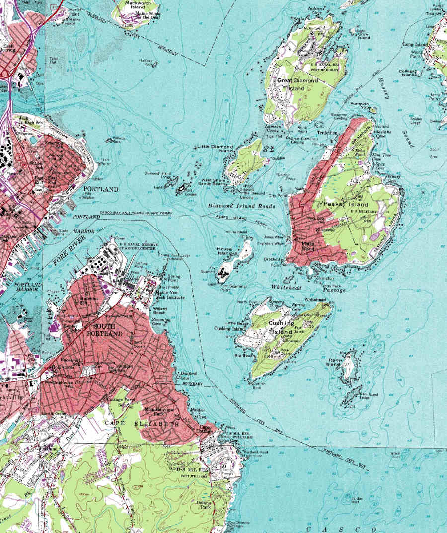 the various passages of Casco Bay. Whitehead Passage (south edge of Peaks Island) and Chandler Cove (just north of Long Island) were permanently closed, and gates were installed at Hussey Sound (north edge of Peaks Island), Littlejohn Passage ( north of Chebeague Island), and Drinkwater Passage (between Cousins Island and main land). Navy guardships were established at each location. Hussey Sound was restricted to naval vessels. The main channel to Portland was protected with mines. The Navy also laid underwater cable loops to aid in submarine detection, while the Army laid fields of bouyant mines. |
