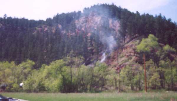 Hwy. 14A, leaving canyon type drive, South of Spearfish. There are several men working on the hill to put out the fire.