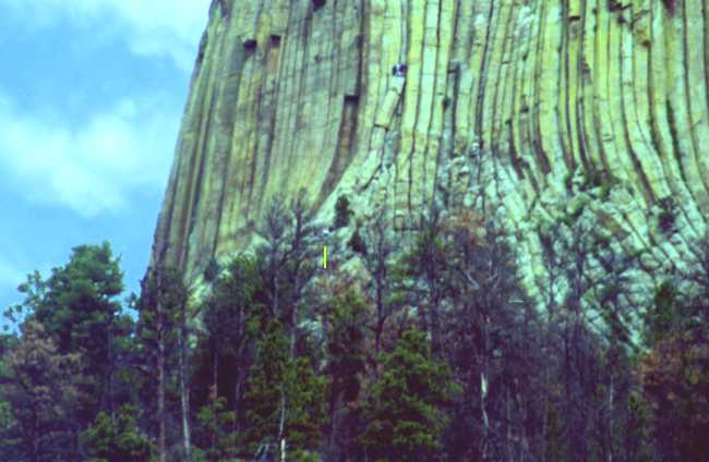 | Above the yellow line is a person in a white shirt with others, watching three climbers in training about 90 feet above them. Vern took this photo while talking with a Ranger, He learned that all rescues have to made on foot because vehicles are not allowed off the roads. |